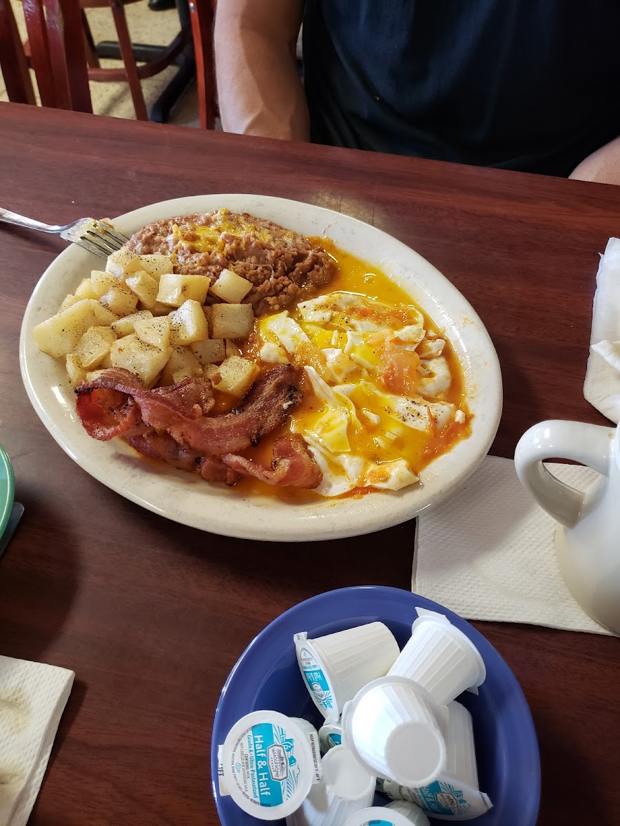 First time trying the pancake special and I got two bacon and egg tacos and added potatoes and cheese. They forgot to put the red and green sauce in the bag but overall the food was good. The pancakes were fluffy and the tacos had a nice portion for the price. I will be back